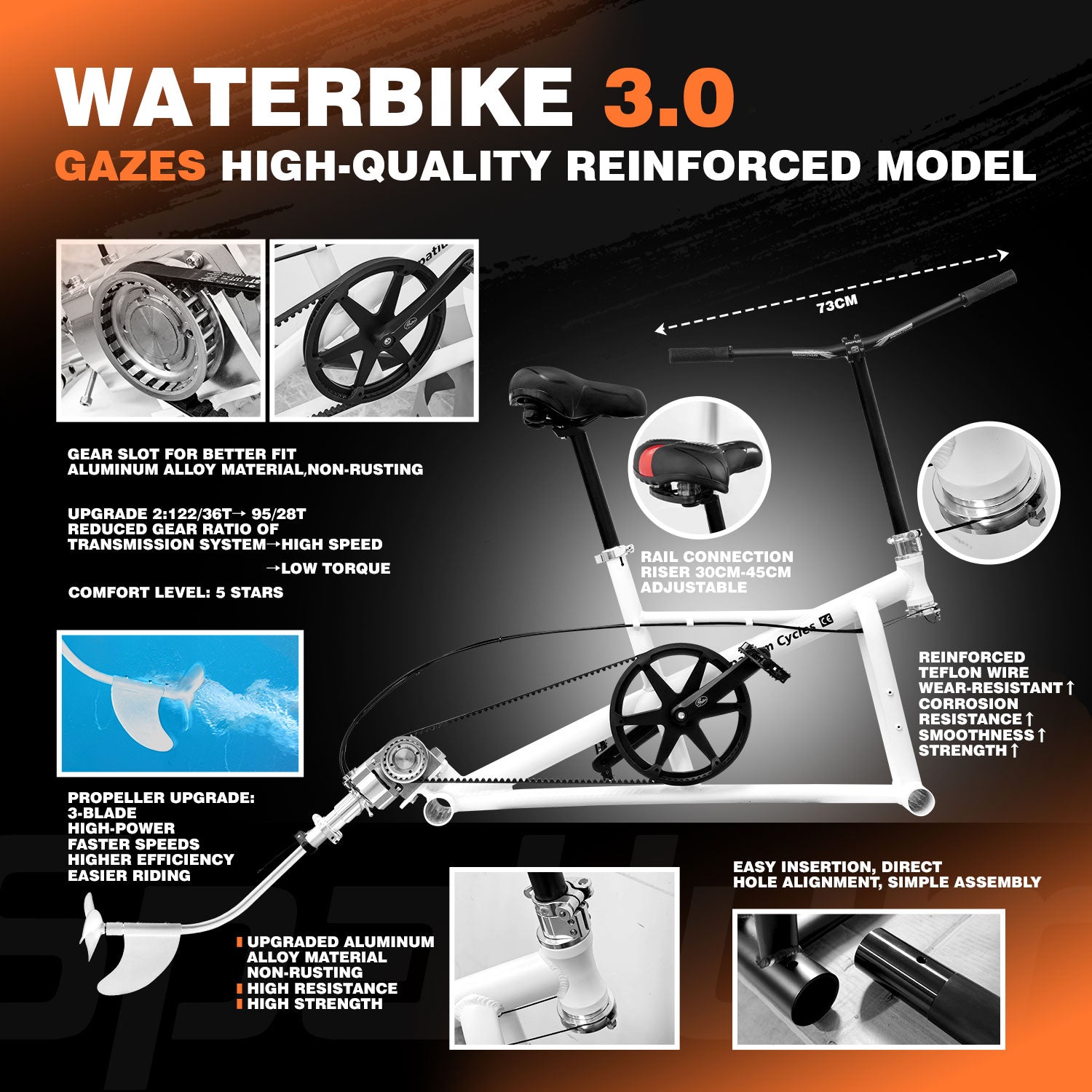 - Frame Upgrade: The Water Bike 3.0 uses a Gates drivetrain with a one-piece flywheel design for the gearbox section, which makes it less noisy while travelling, grips the gears better, is less prone to falling off, and is resistant to wear and tear. The handlebar is lengthened to 73cm and the seat tube can be adjusted up and down, which is more in line with the ergonomic design. Both sides of the seat are filled with air bubbles for more comfort.