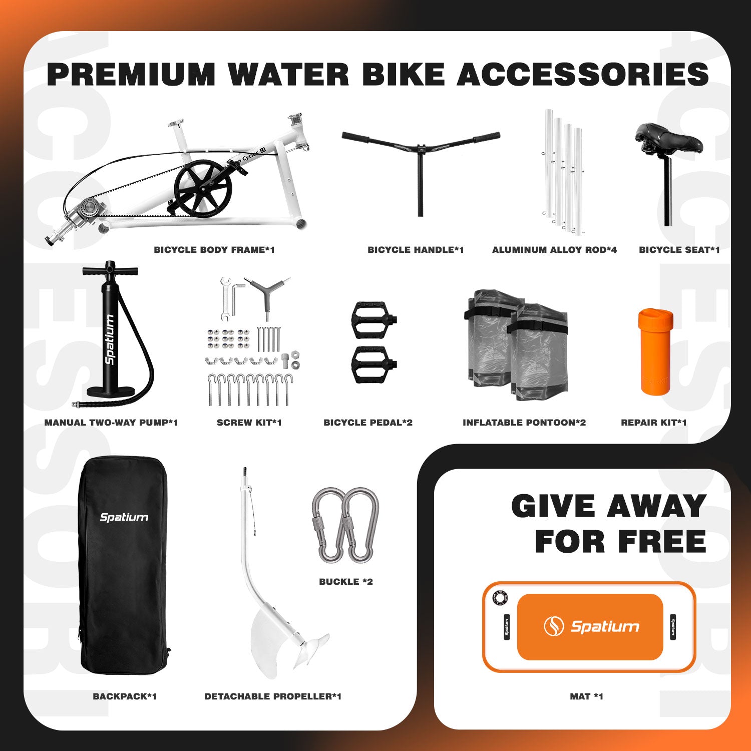 - Portable Folding Water Bike: Inflatable Water Bike can be disassembled and assembled within a few minutes. The size of the frame can be easily put into the trunk of a family car,and the pontoon can be inflated. It adopts a quick release and easy to fold design, and can be put into a backpack after deflation.